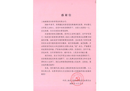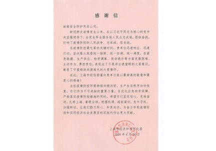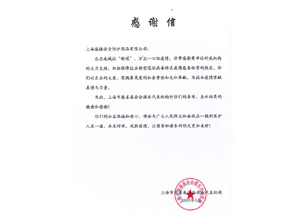 感謝信 上海市慈善基金會浦東代表機構(gòu)