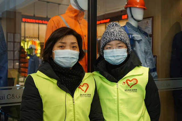 楊高虹和胡晨芳是一對母女,女兒是95后,媽媽是75后。她們早上8點(diǎn)半就到崗了,戴口罩、量體溫、登記、核查身份,全部通過后才能上崗。