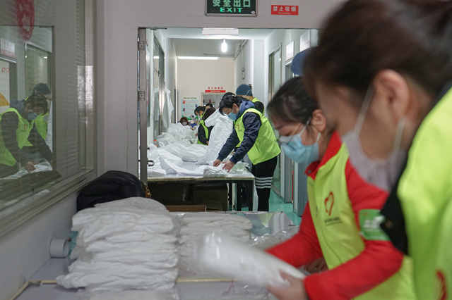 志愿者的工作為輔助性質(zhì),為配合一線技術(shù)工人的工作時(shí)長,志愿者服務(wù)時(shí)間分為白班和夜班。白班為早上8點(diǎn)至晚上9點(diǎn),夜班為晚上9點(diǎn)至凌晨5點(diǎn)。每個(gè)班次至少20人,并適時(shí)根據(jù)生產(chǎn)要求增加。長時(shí)間、高強(qiáng)度的班次安排,對專業(yè)的技術(shù)工人來說壓力都不小,對志愿者的挑戰(zhàn)就更大。志愿者嚴(yán)帥說:“我們技術(shù)工作做不了,但疊衣服和裝箱,都能干!”長時(shí)間站立、埋頭工作非常辛苦,但很多志愿者都舍不得輪換休息,從頭到尾不停地在工作。